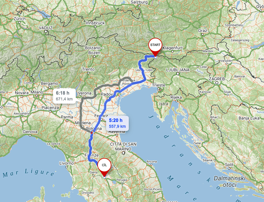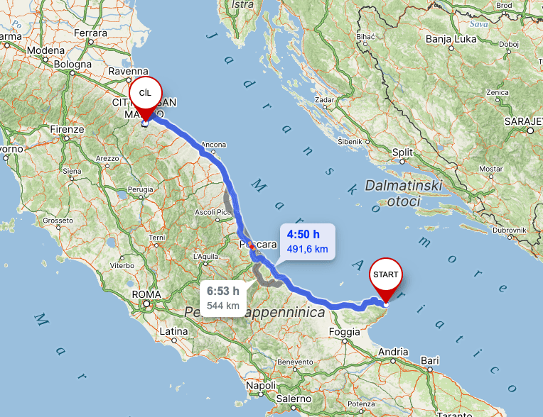 Po obědě vyrážíme směr San Marino, kde máme v plánu přenocovat. Ale tentokrát tenhle mikro-státeček vynecháváme – byl by to výlet na celý den a čas už nemáme. A upřímně – peněženka taky hlásí „prázdno“. Necháváme si ho na příště. Teď jen klidná noc, přespání a ráno natankovat nejlevnější naftu v Itálii a rovnou domů.