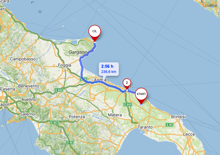 Po obědě to balíme. Naštěstí sprchy a toalety poblíž pláže jsou zadarmo – aspoň něco pozitivního. A pak už jen rychle zpátky do dodávky, projet Bari alespoň z okna a zamířit na sever. Ale ať Bari nekřivdíme úplně, tak historické centrum je prý hezké, avšak na to už nebyl prostor se tam podívat.
