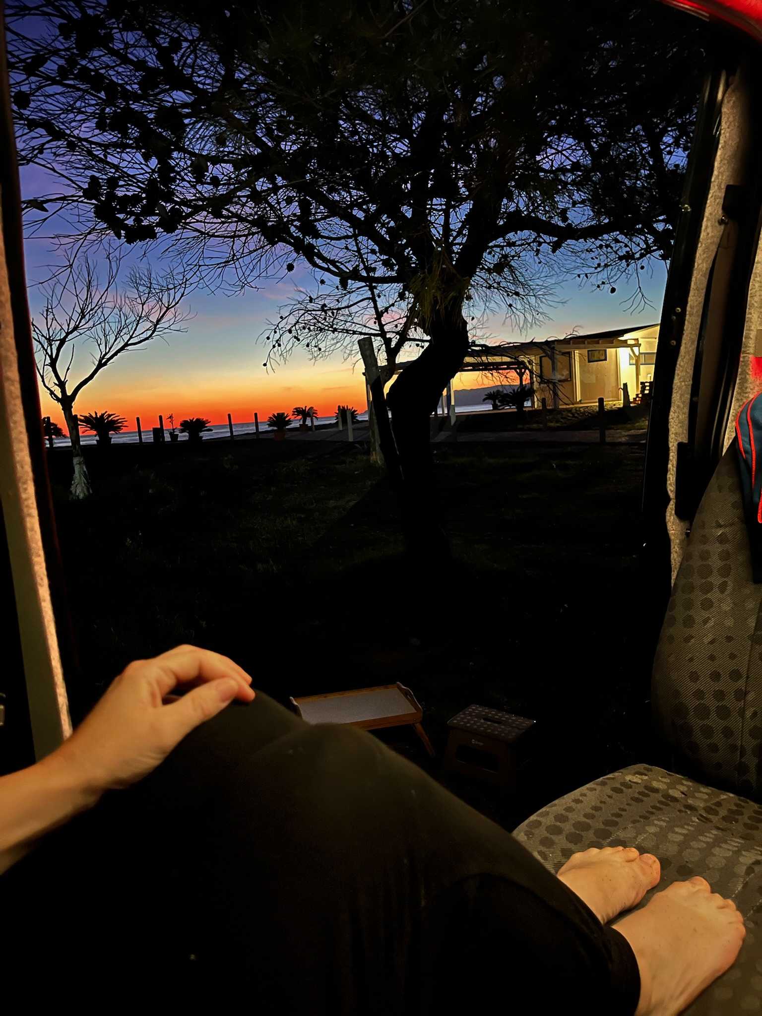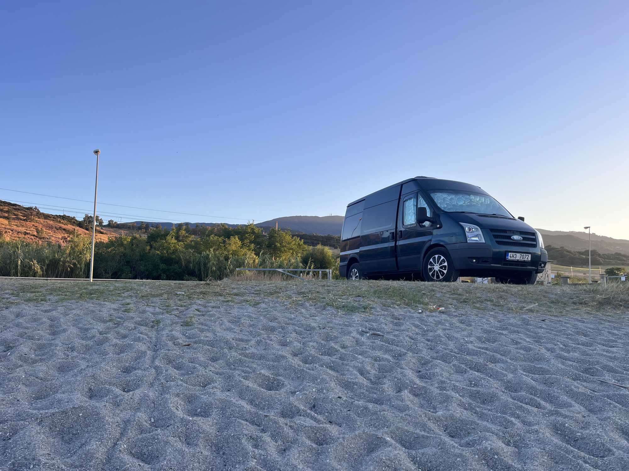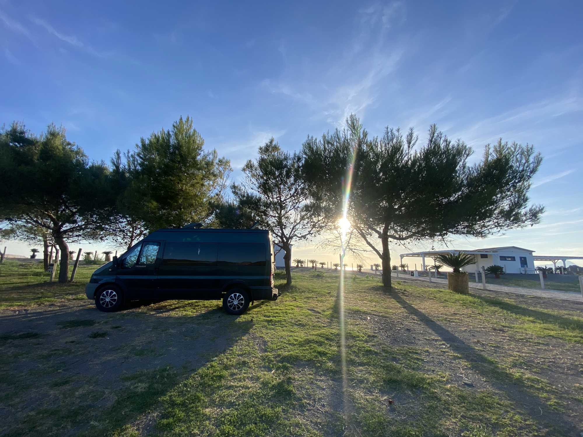 K večeru nám začíná být jasné, že do Tropey už dnes nedojedeme tak, abychom si ji v klidu užili. A parkovat tam po tmě? To by nebyl dobrý nápad. Nakonec to řešíme chytře – parkujeme na „parkovišti“ u pláže za Falerna Scalo, kde už stálo několik italských obytňáků. Klid, šumění moře a výhled na východ slunce jako třešnička na dortu.