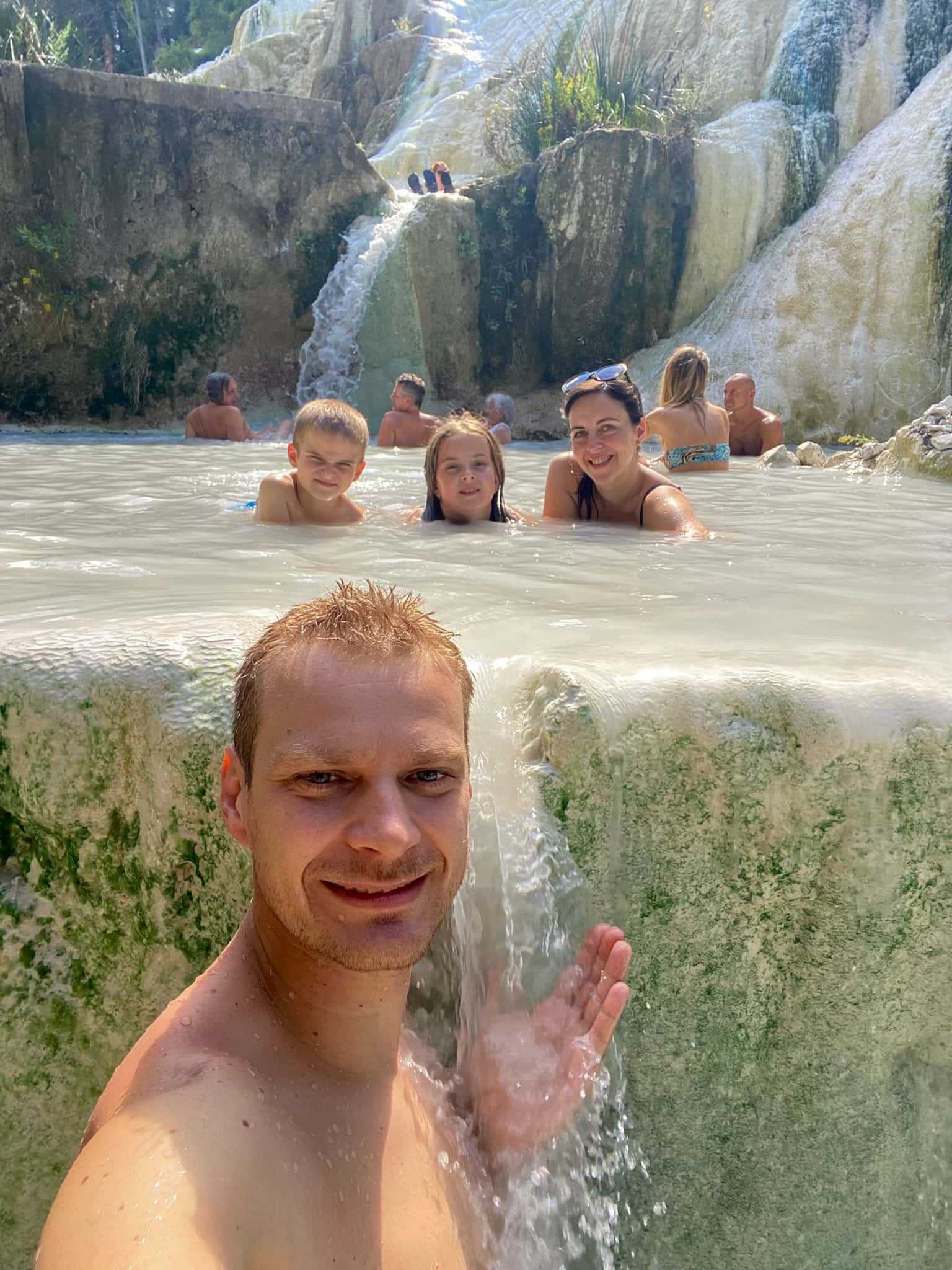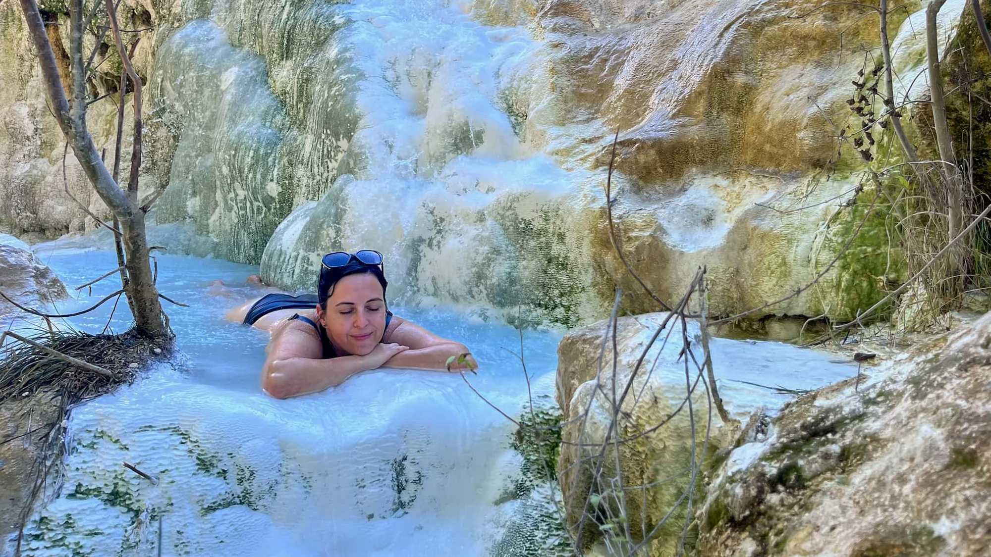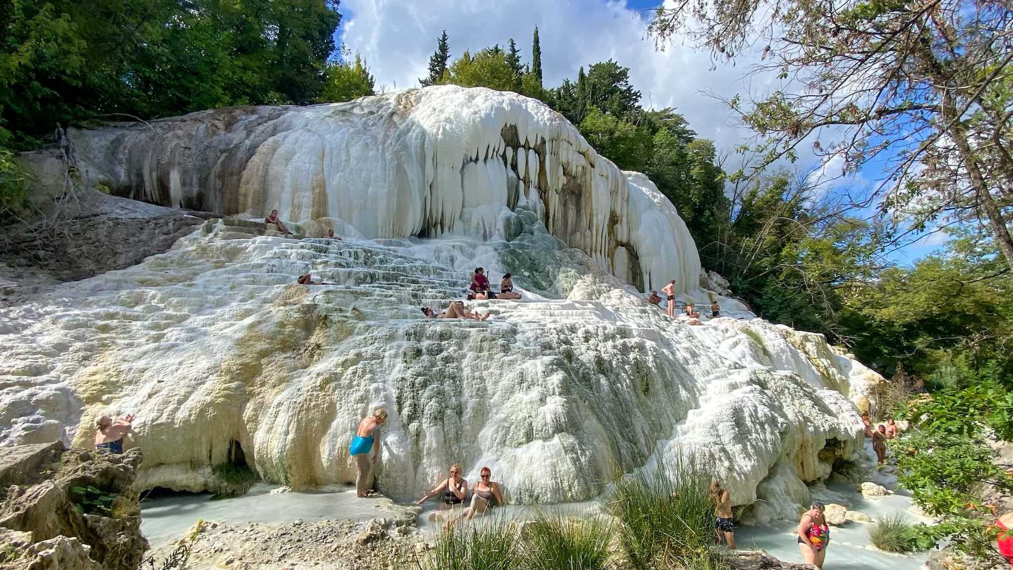 Cestu k lázním najdete i bez navigace – prozradí ji všudypřítomná sirná „vůně“. Bagni San Filippo jsou známé hlavně díky „Bílé velrybě“, obřímu vápencovému útvaru, po kterém stéká horká minerální voda. Teplota má kolem 40 °C a vytváří malé tůňky, ve kterých se dá příjemně relaxovat. My jsme zůstali pod stékající vodou – krásně horká. Jen místa tu moc není a upřímně si neumím představit, jak to vypadá v sezóně.
