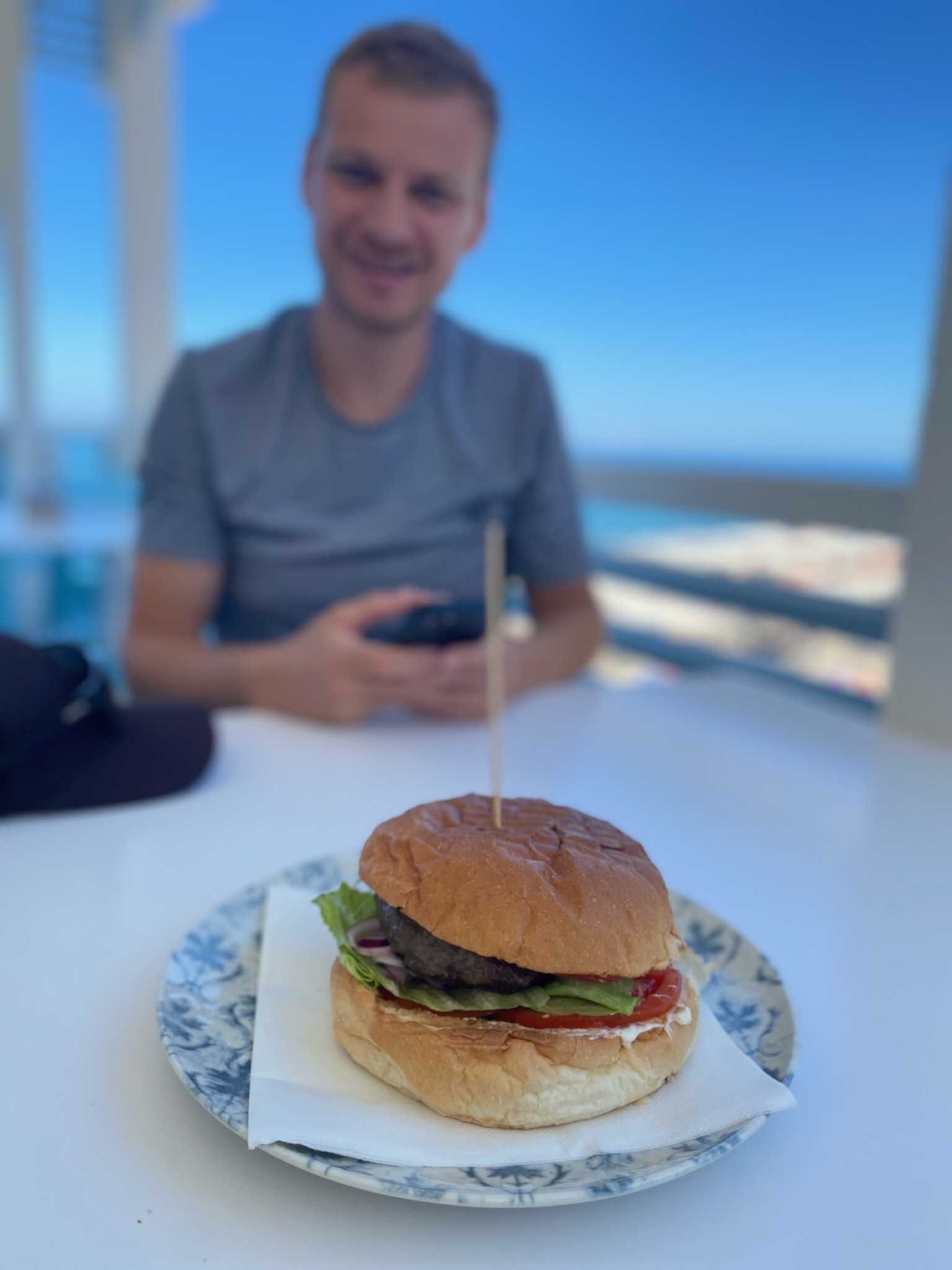 No, chyba. Dostáváme nejdražší a nejhorší kávu celé dovolené. K tomu smutný burger – malý, suchý a předražený. Jídlo zklamání. Atmosféra nic moc.