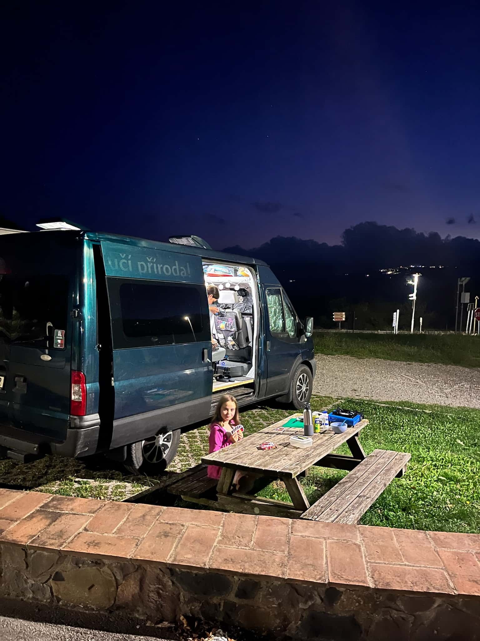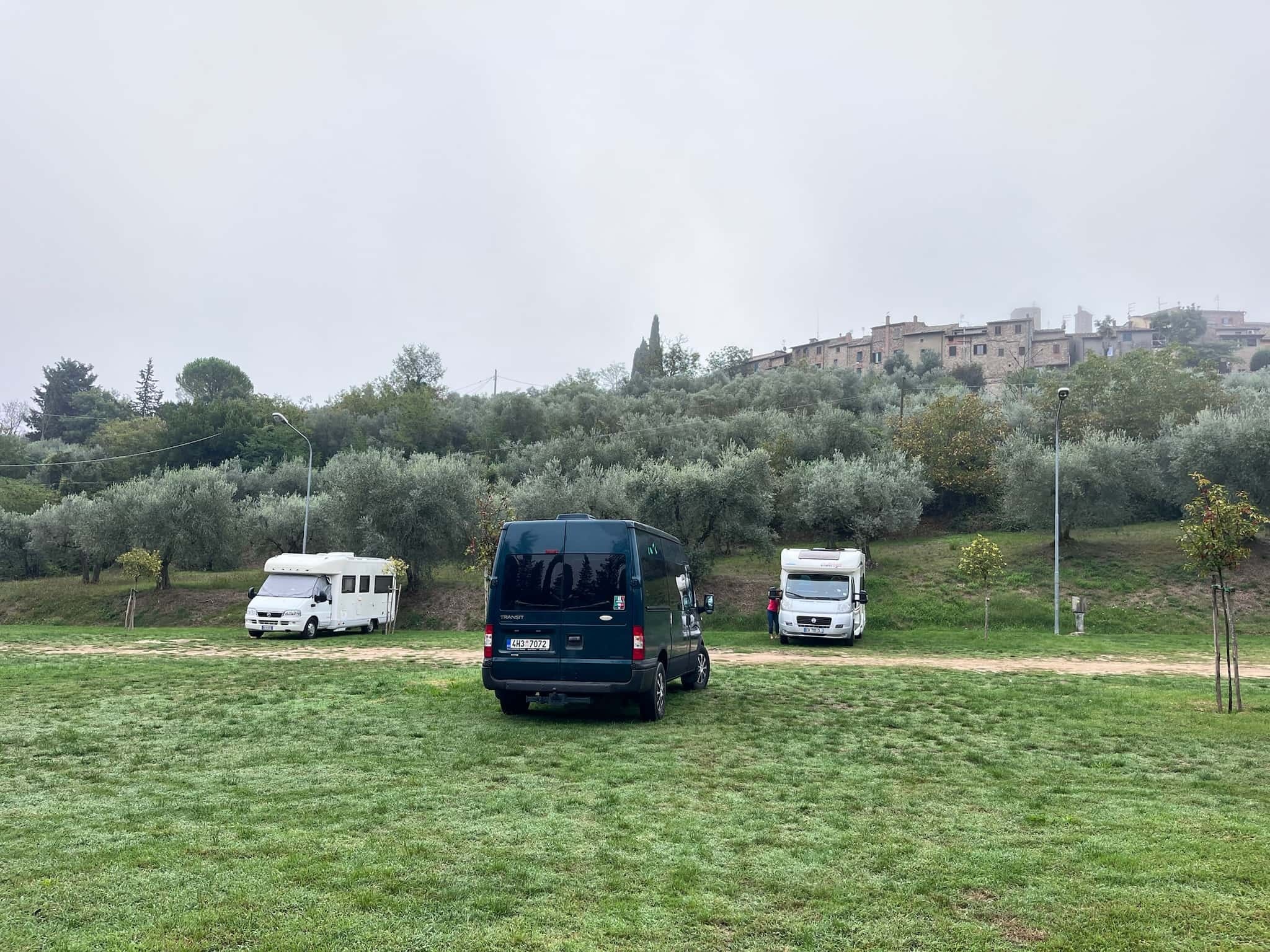 Po náročných cca 600 dálničních kilometrech parkujeme navečer zdarma na místě pro karavany a campery, které jsme našli přes P4N – pod historickým centrem města Lucignano. Jde se spát!