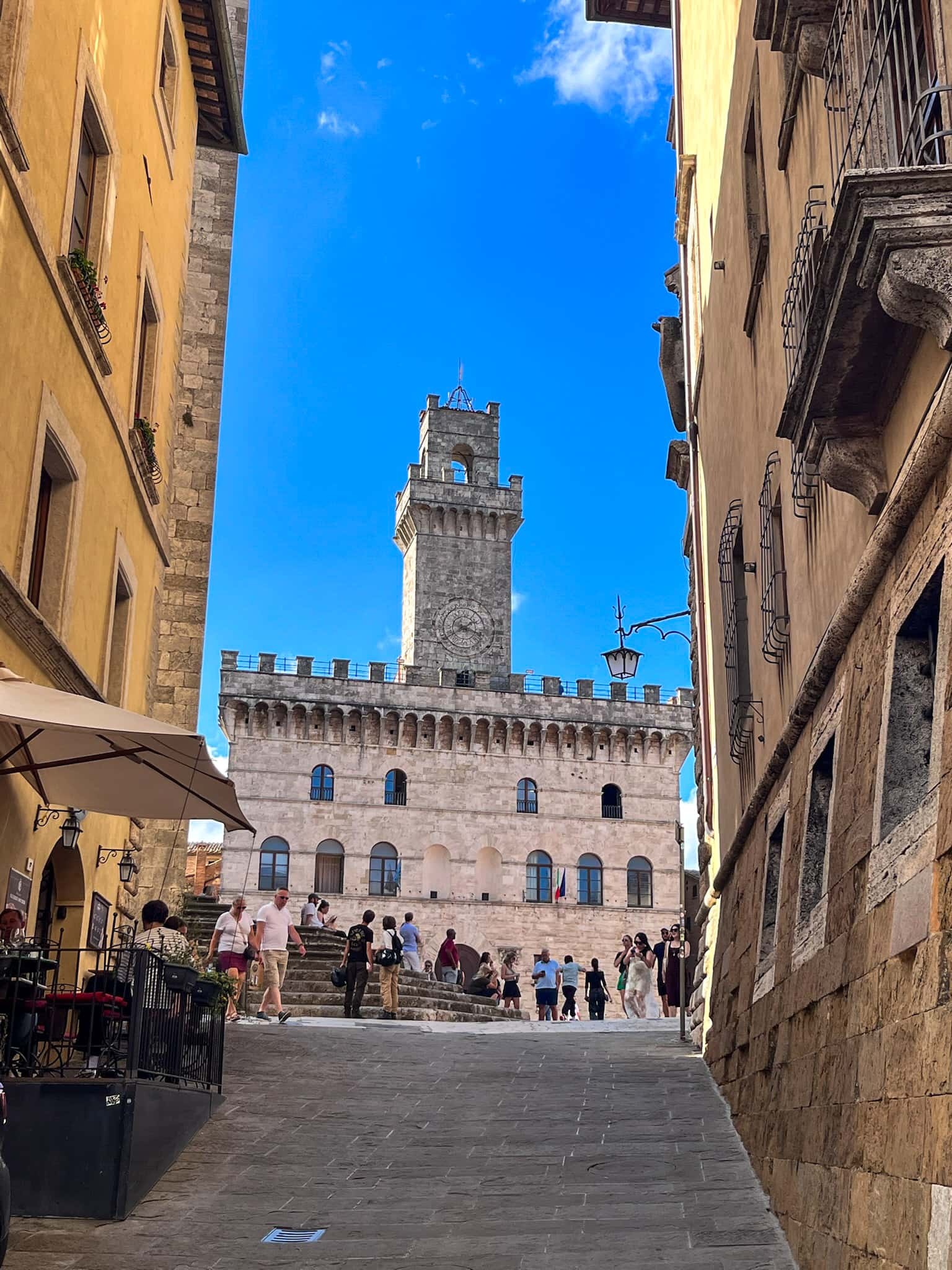 Montepulciano je nádherné historické město, i když turistů je tu požehnaně. Nám osobně víc sedí ta menší a klidnější městečka, ale i tak to tu má své kouzlo. Naším hlavním cílem je navštívit radnici, kde se natáčela slavná scéna ze Stmívání – a tak stoupáme na nejvyšší bod města.