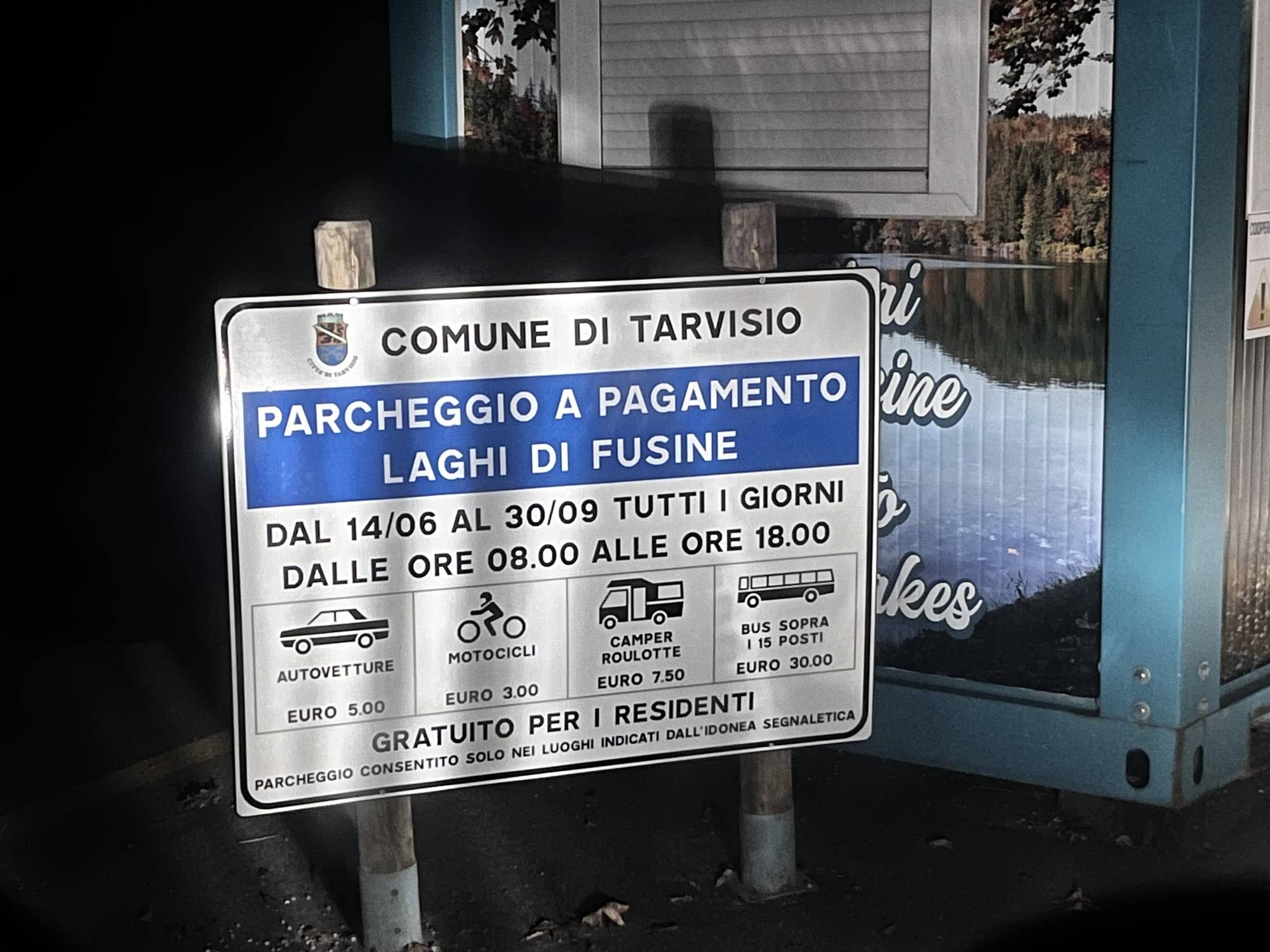 Po desáté večer dorážíme k Lago di Fusine. Tma jak v pytli, takže netušíme, kam přesně koukat – někde parkujeme, kde se nám to zdá v pohodě. Zatím zdarma, klid, ticho… těšíme se na ráno.