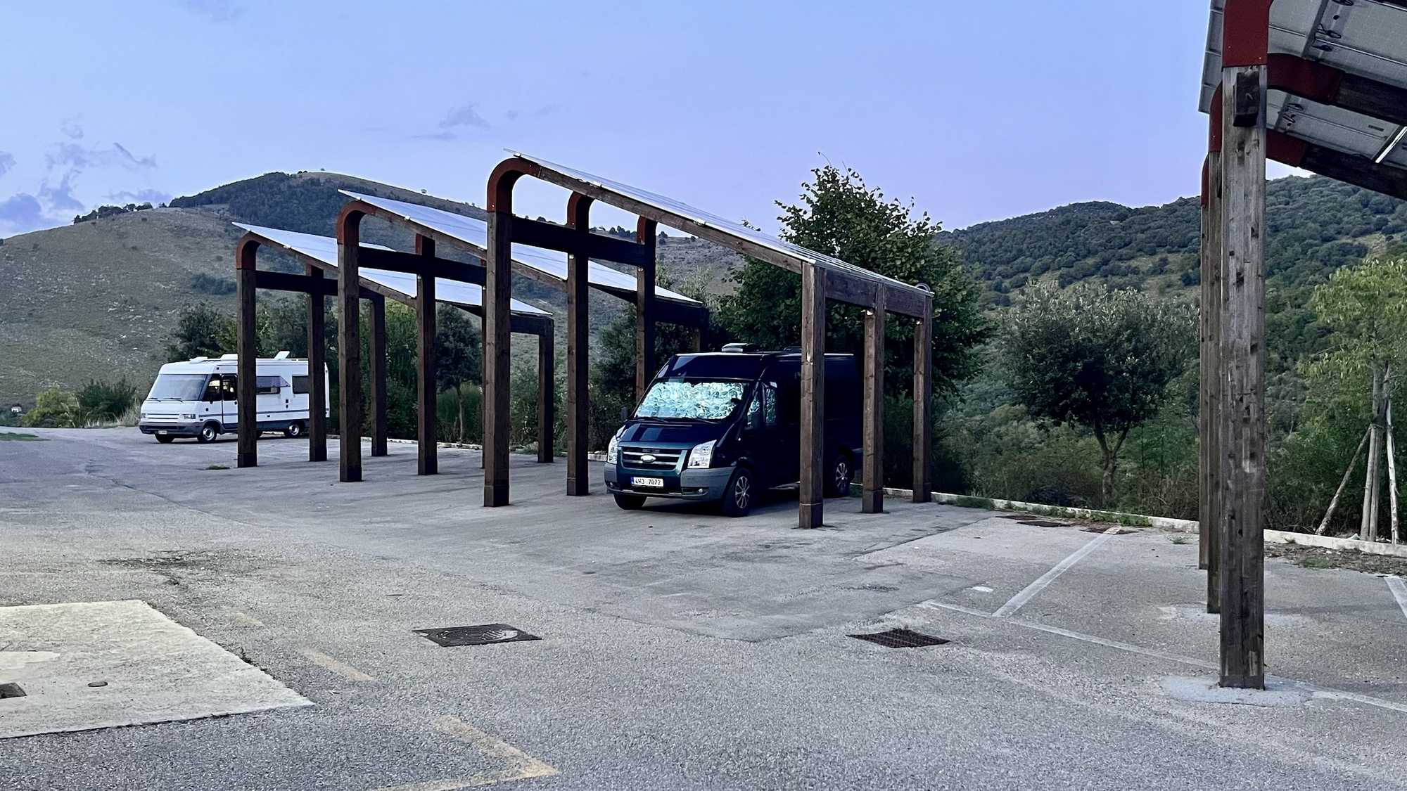 Na večer parkujeme v Castellana Grotte. No, parkoviště nic moc – vedle nějakého skladu. Technicky v pohodě, je to určené pro campery, ale romantika nula. Hlavně že je tam voda a místo na vylití WC.