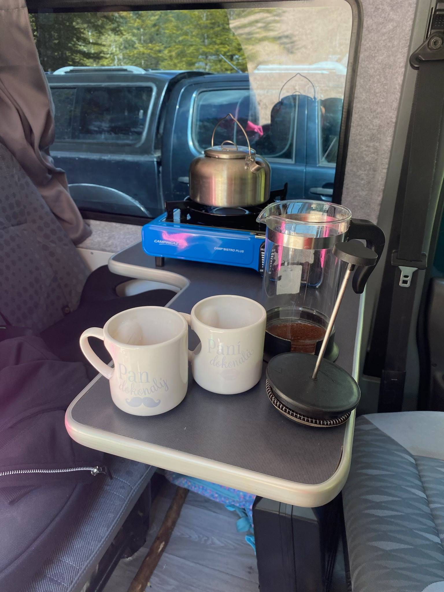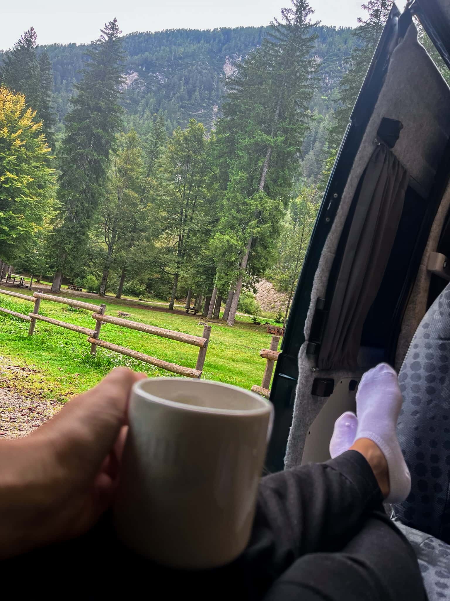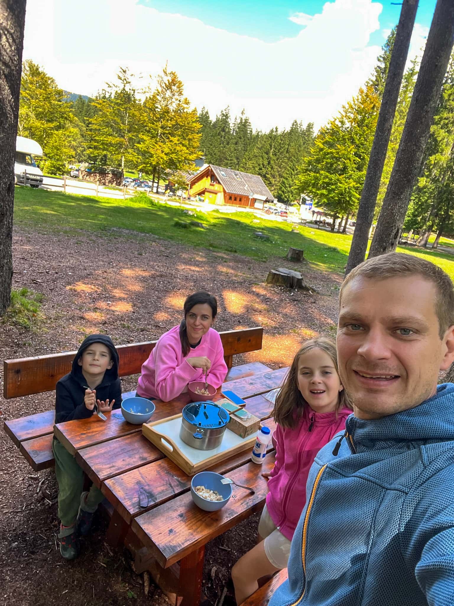 Ráno se probouzíme pod peřinou a hned je nám jasné, že jsme v horách – v autě sotva 10 °C. Takže vytahujeme tepláky a trochu se roztřásáme zimou. Venku mlha a opar zakrývají vrcholky Julských Alp, ale postupně se zvedají a odhalují neuvěřitelný výhled. V tu chvíli víme, že stálo za to dorazit sem v noci.