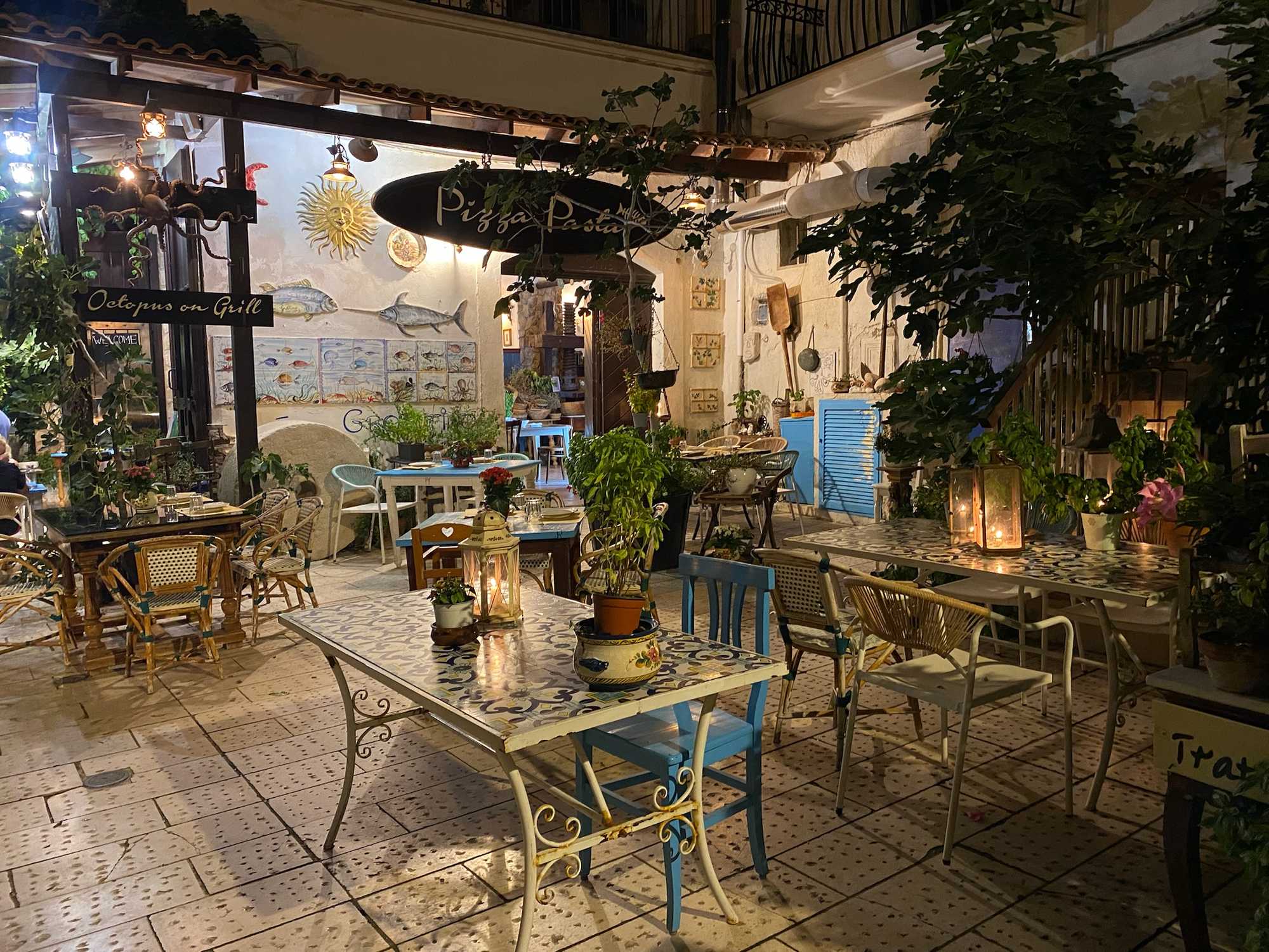 Po jídle zjišťujeme, že místní specialitou je grilovaná chobotnice – skoro každý u stolu si ji dal. My už ale měli plná břicha, takže smůla. Ponaučení pro příště: nejdřív se zeptat, co je specialita, a až pak objednávat.