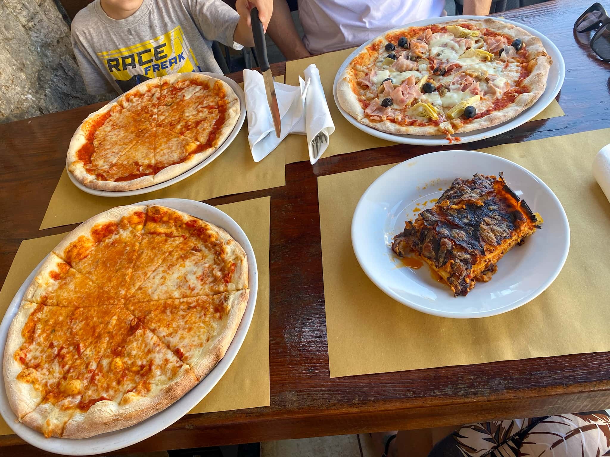 A jídlo? Jedna z nejlepších večeří v celé Itálii! 3 pizzy, hamburger, salát, dva předkrmy, dezerty, piva, aperoly… a to všechno za 60 €! Nechali jsme pořádné dýško – zasloužené.