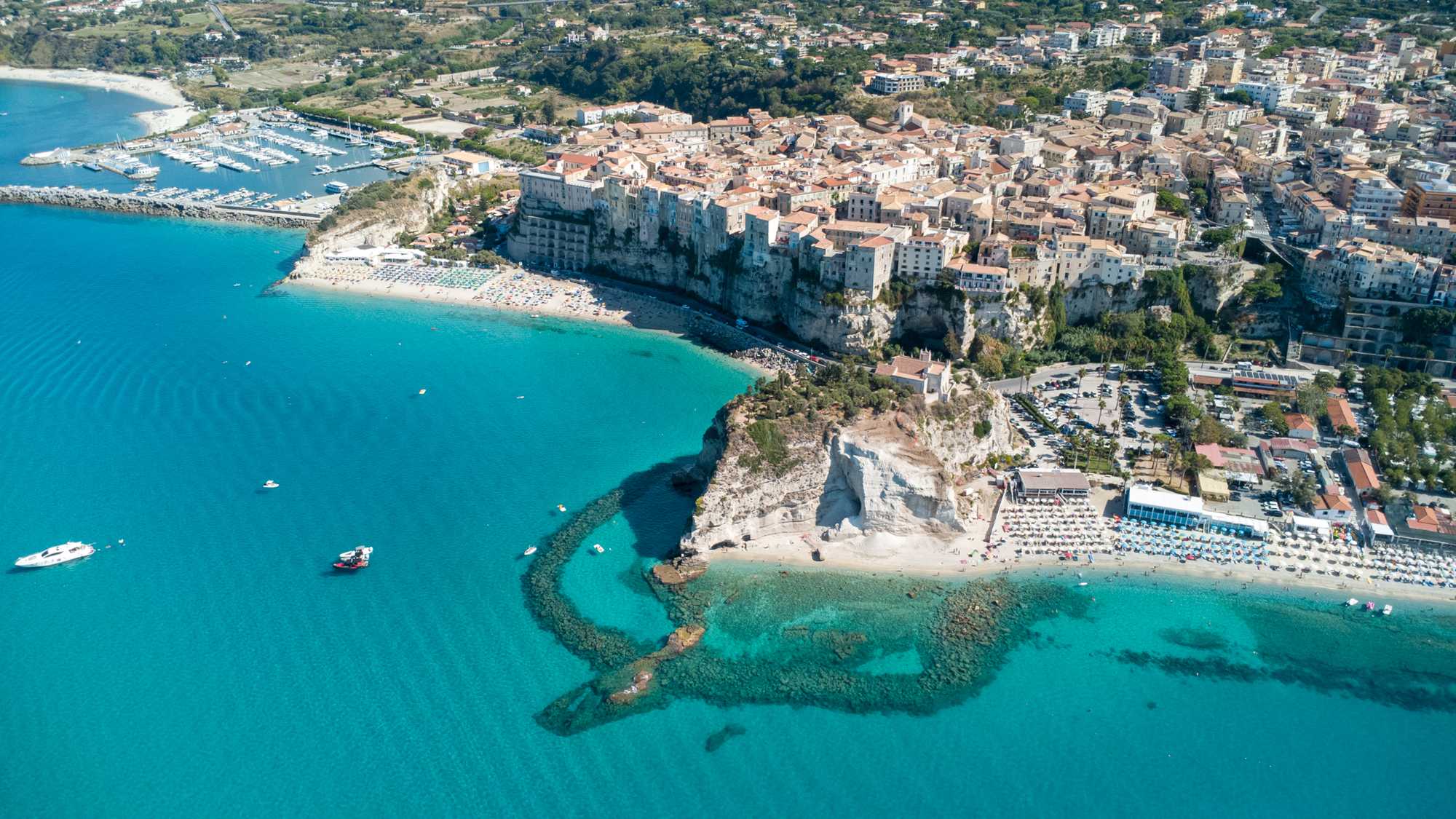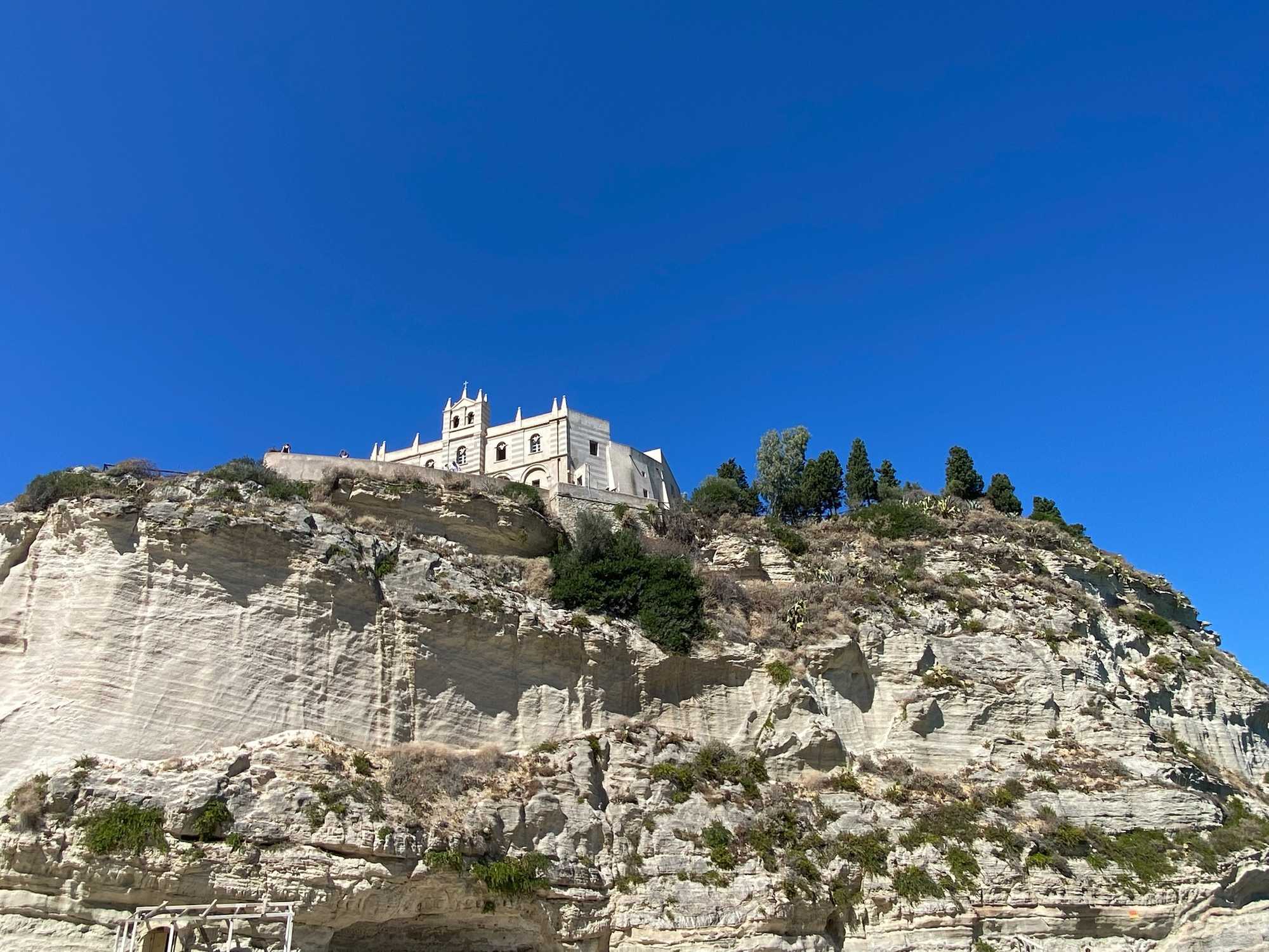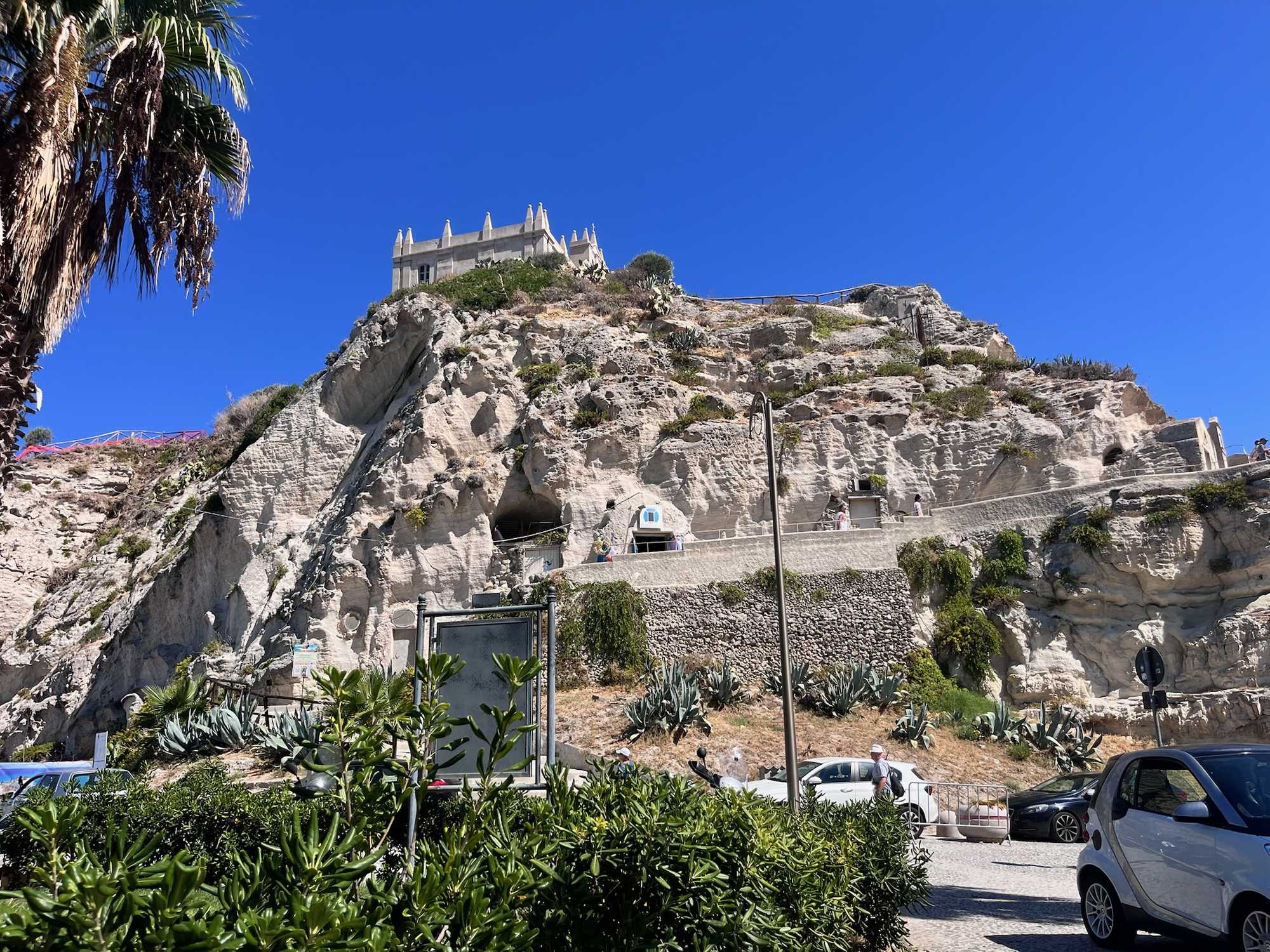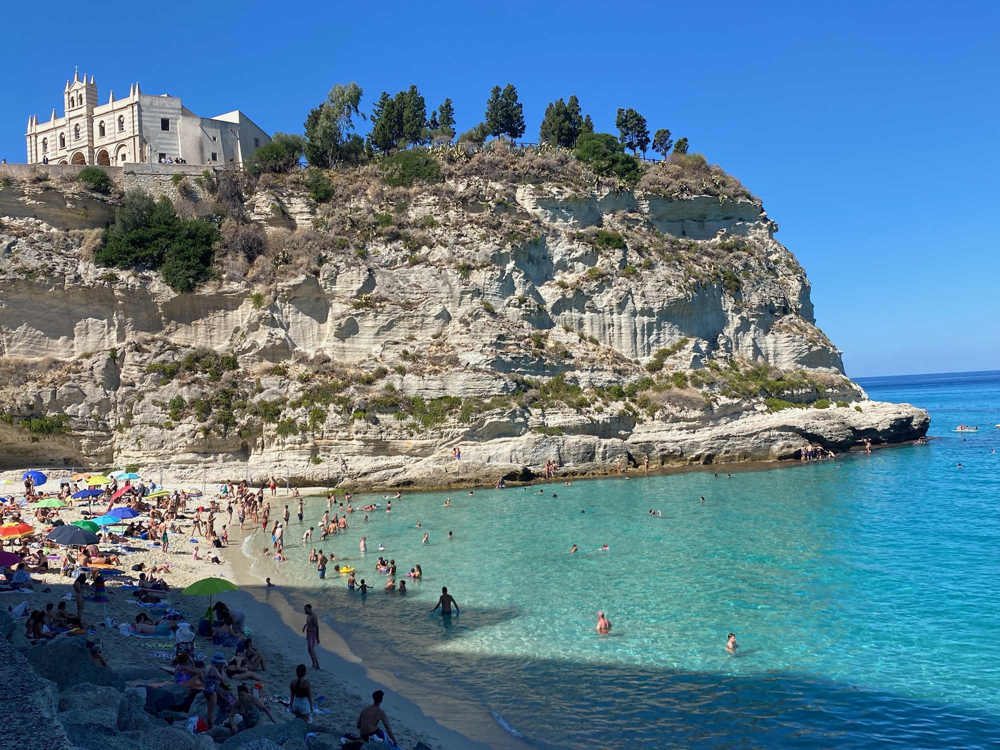 Ráno jsme dorazili do Tropey – přesně v 9:00 jsme parkovali u Spiaggia della Rotonda. A že to bylo tak tak. O hodinu později už nebylo kde nechat auto – ani na velkém parkovišti pod ikonickým kostelem Santa Maria dell’Isola.